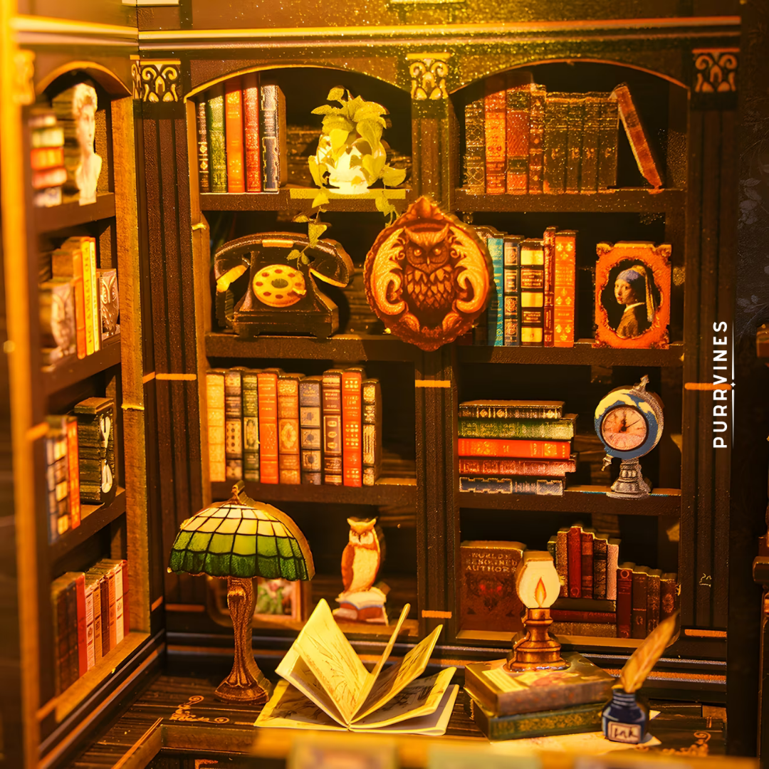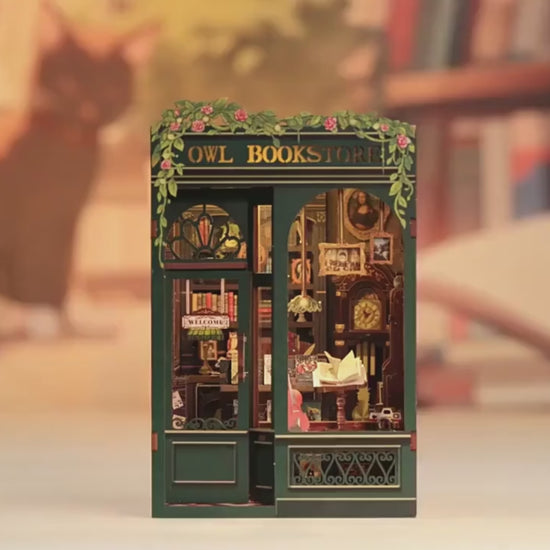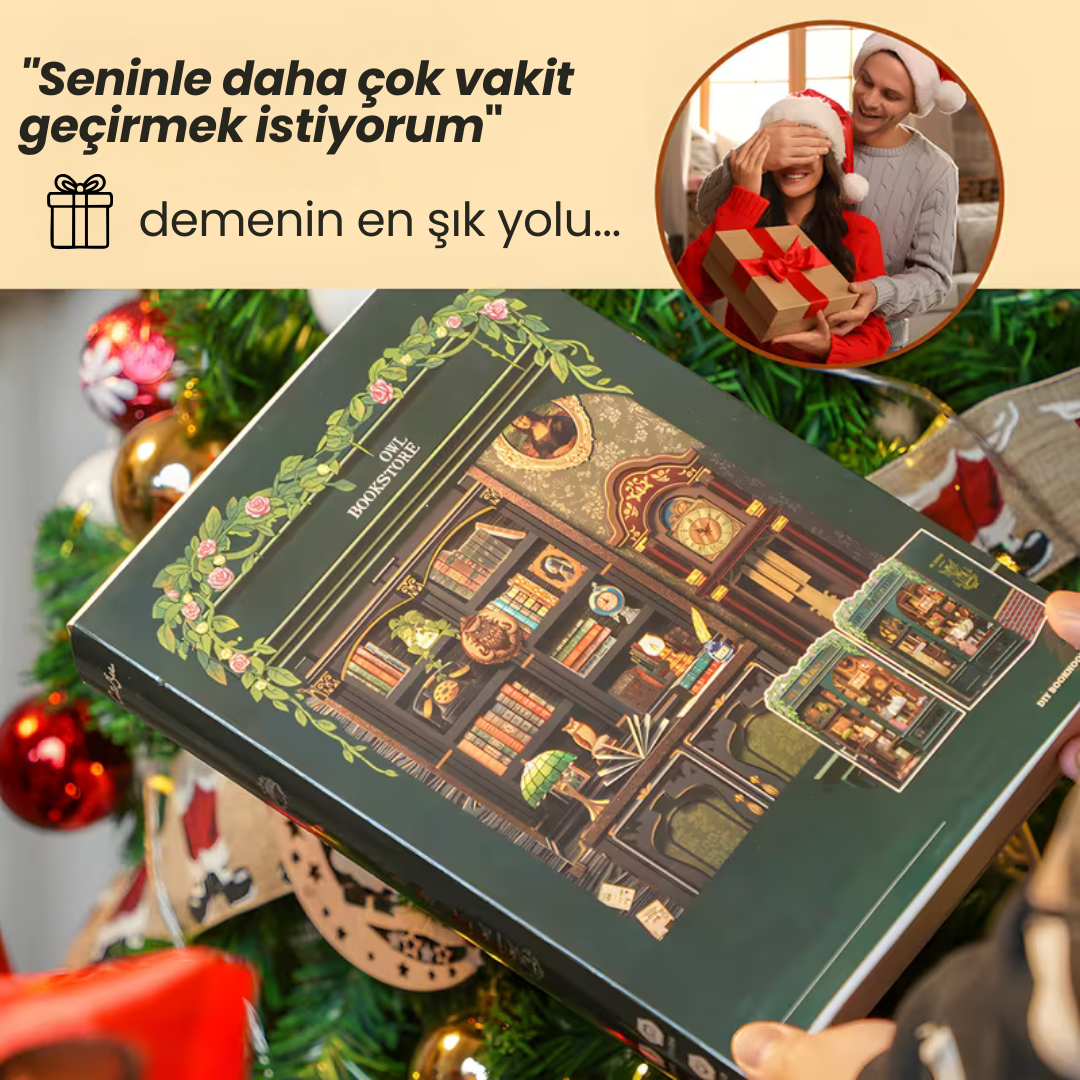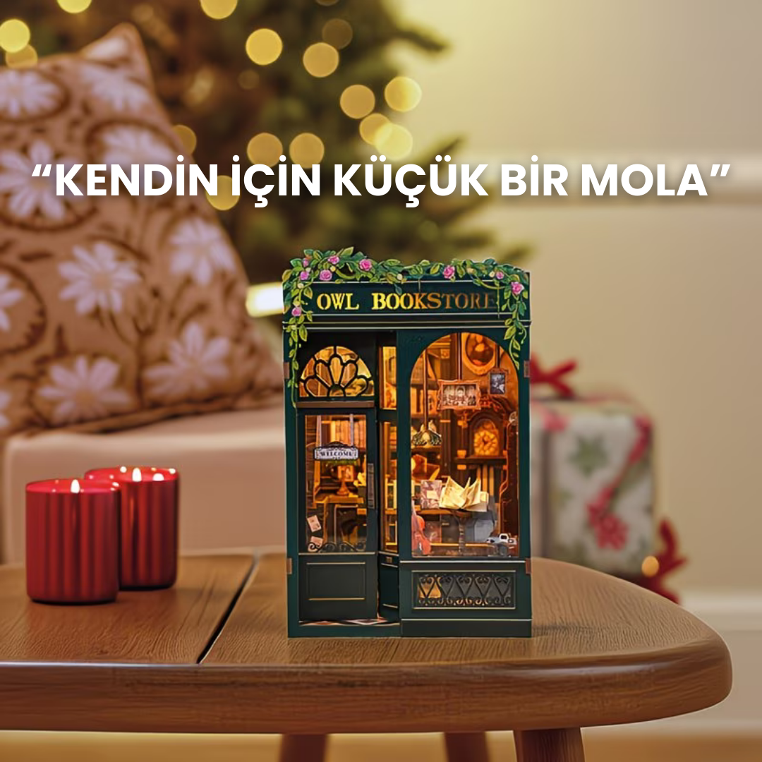 Baykuşhane Kitapçısı, kitaplarınızın arasına yerleştirilen ahşap bir mini dekoratif kit. Sıcak ışığı ve detaylı tasarımıyla kitaplığınıza masalsı bir atmosfer katar.